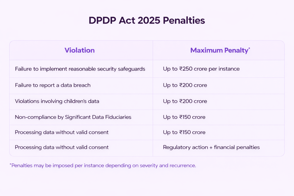 The DPDP Act 2025 introduces significant financial consequences for non-compliance. Unlike earlier regulatory frameworks, where penalties were sporadic or symbolic, this data protection law in India is designed with teeth for enforcement.