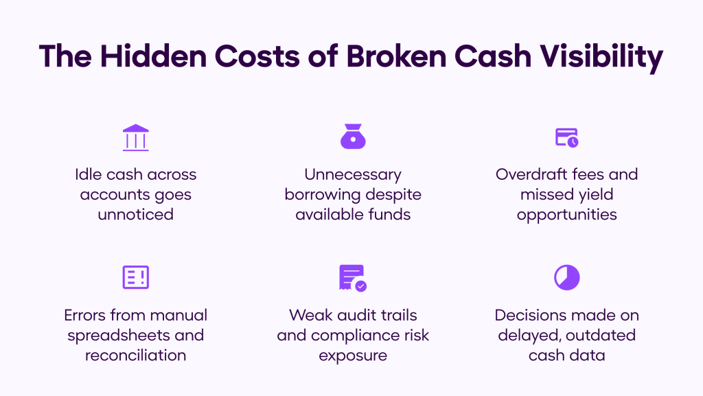 When visibility is incomplete, surplus funds in one account often sit untouched while another part of the business faces a shortfall. The issue isn’t availability, it’s awareness.