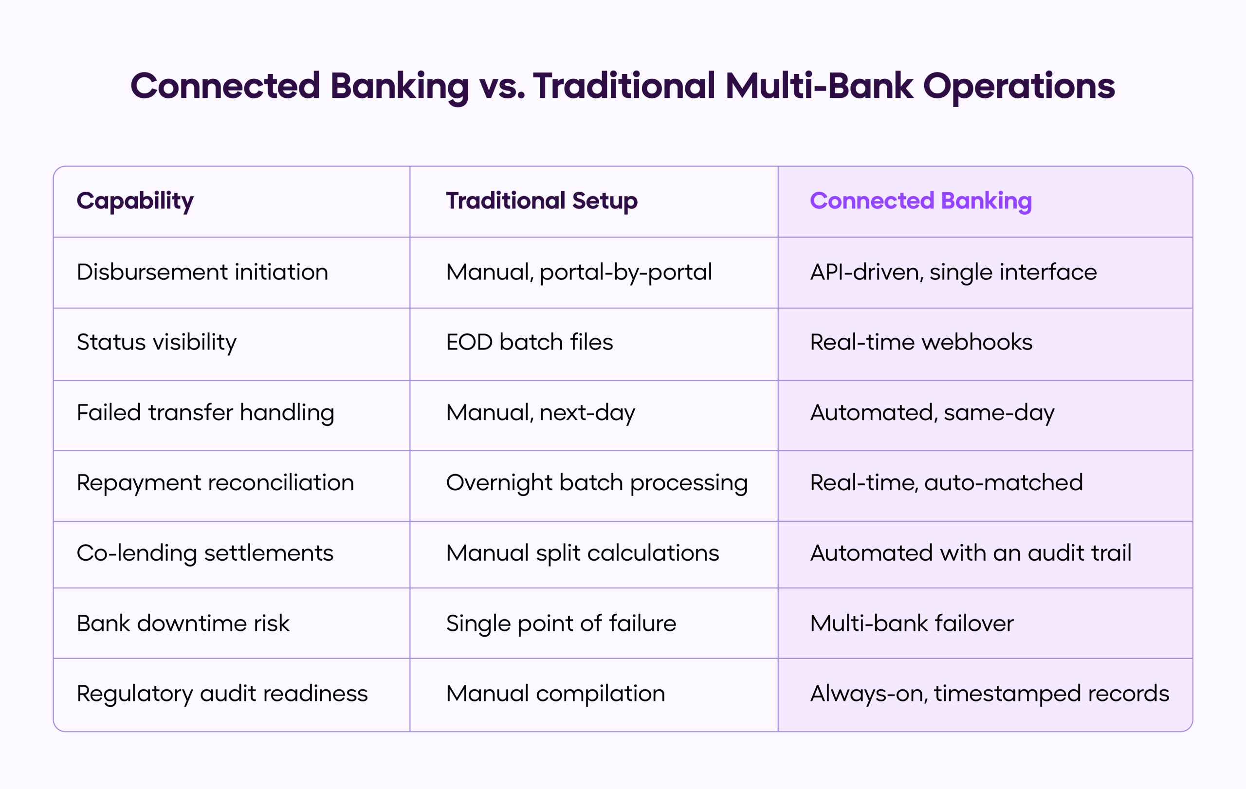 This is exactly the problem that connected banking for NBFCs is designed to solve. And with the RBI mandating direct fund flows between lenders and borrowers, real-time visibility into disbursements and repayments isn’t just a nice-to-have anymore — it’s a compliance requirement.