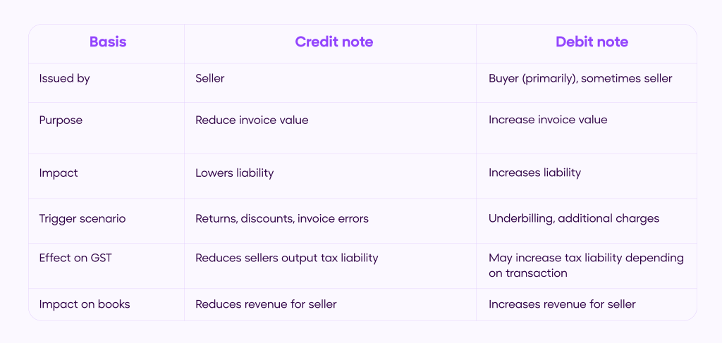 A credit note is issued by a seller to reduce the amount a buyer owes due to returns, discounts, or invoice corrections. A debit note is typically issued by a buyer to request a reduction in the amount payable due to discrepancies or returns. Additionally, A debit note is not always sent by the buyer—in some cases, a seller may issue it to correct underbilling.